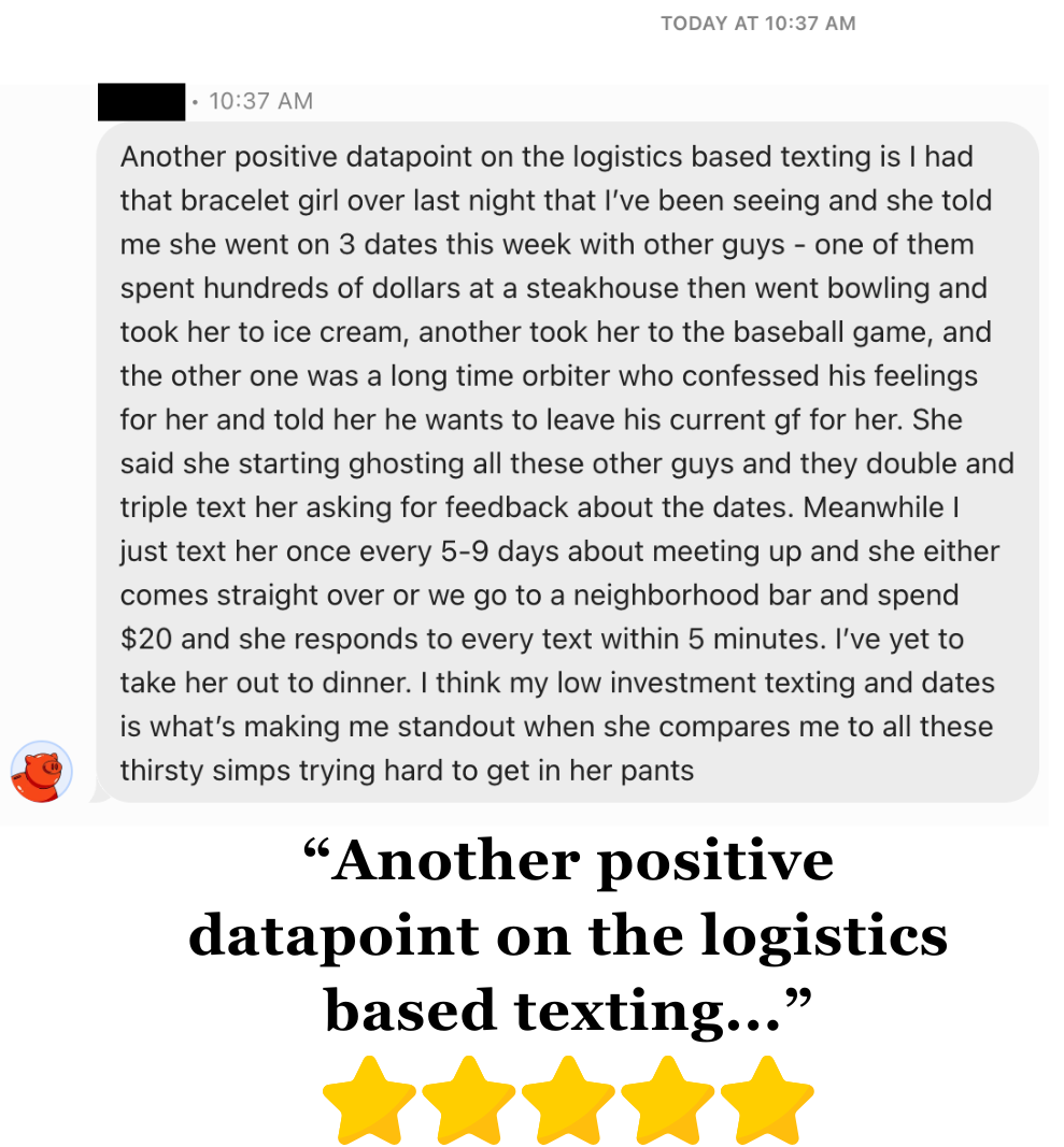 What you get is a 24/7 relationship coach that I PERSONALLY USE trained on hundreds of unique data points (and counting):